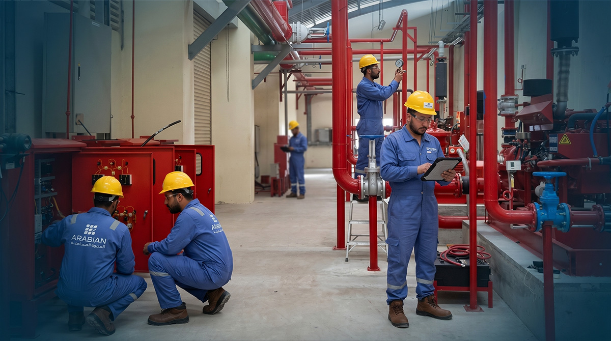 Early detection, occupant alert, and effective suppression. Addressable fire alarms, sprinkler systems, fire pumps, standpipes, special hazard systems, and passive fire protection—designed and installed to NFPA and Saudi Civil Defense standards.